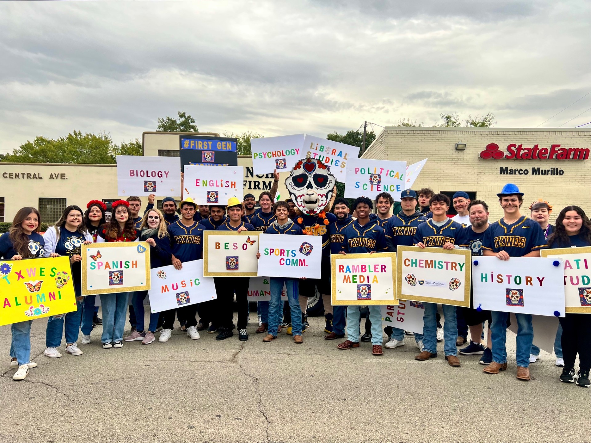 The TXWES contingent, comprised of Spanish and Bilingual Education majors; members of the Student Government Association (SGA), Bilingual Education Student Organization (BESO), and Latinx Student Association (LSA); faculty from the School of Arts and Sciences (SOAS), alumni, and friends of the RAMily, was led by some twenty members of the baseball team and Coach Robert Garza, all sporting TXWES baseball jerseys and proudly bearing the TXWES standard. After having their faces painted à la Coco by Spanish majors Beatriz Sandoval, Daisy Muñoz, Vanessa Márquez, and Arianna Medina, the group fit right in, marching amid a vibrant procession of colorful catrines and catrinas (skeleton figures dressed in elegant attire), traditional dancers, mariachi bands, and community organizations.