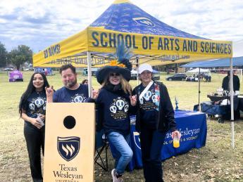 Following the parade, TXWES Spanish students and faculty, along with members of the SGA, LSA, and alumni volunteers, engaged with festivalgoers at Marine Park—chatting about the many benefits of attending Texas Wesleyan and inviting them to play cornhole for a chance to win TXWES swag.