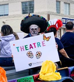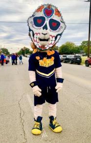Willie the Ram drew cheers and fist bumps from paradegoers, who were delighted to see him wearing a festive Día de los Muertos calavera mask custom-made by freshman Theatre major, Geovana Ortiz. Theatre Wesleyan’s own Joe Brown (aka “Pro Joe”) joined the parade in full catrín face paint and costume. A TXWES Facilities truck driven by Dr. Ricardo Rodriguez, dean of the School of Arts and Sciences, was decked out with papel picado, sugar skulls, tissue paper flowers in autumn colors, and three-dimensional monarch butterflies. The truck pulled the TXWES float, decorated in matching style and filled with waving students and alumni, while marchers handed out Mexican-style candy to excited onlookers along the route.